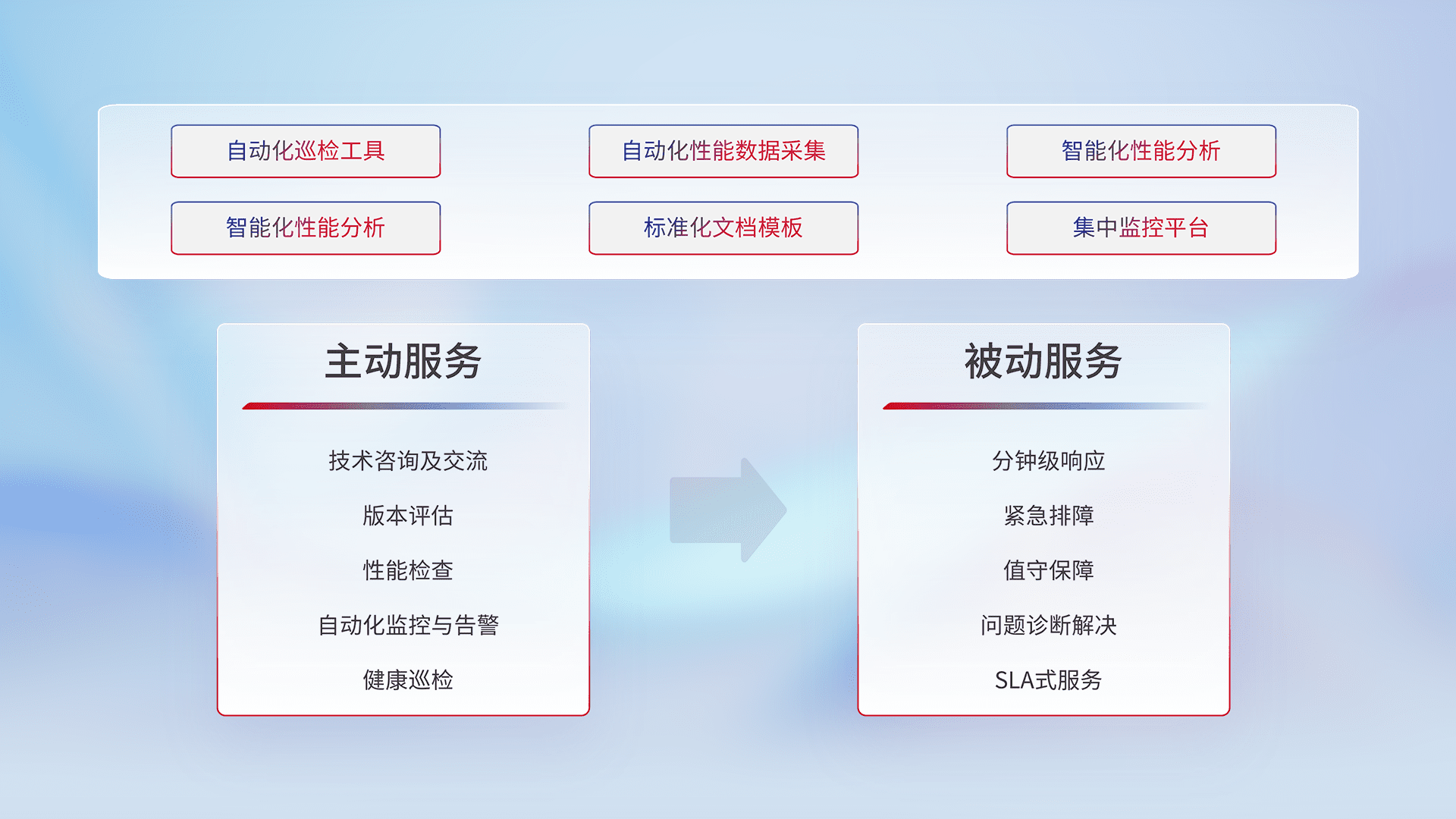 智能化工具和标准化文档,,,保障服务质量,,提供主动服务(包含技术咨询、、版本评估、、、性能检查、、自动化监控与告警、、、、健康巡检)和被动服务包含(分钟级响应、、紧急排障、、、值守保障、、、、问题诊断解决、、SLA服务)。。。